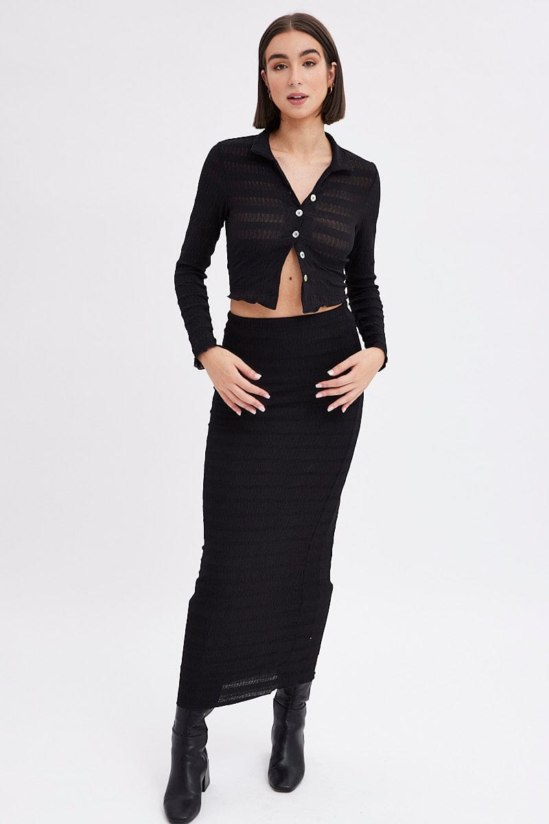 Black Crop Shirt Long Sleeve Collar Textured