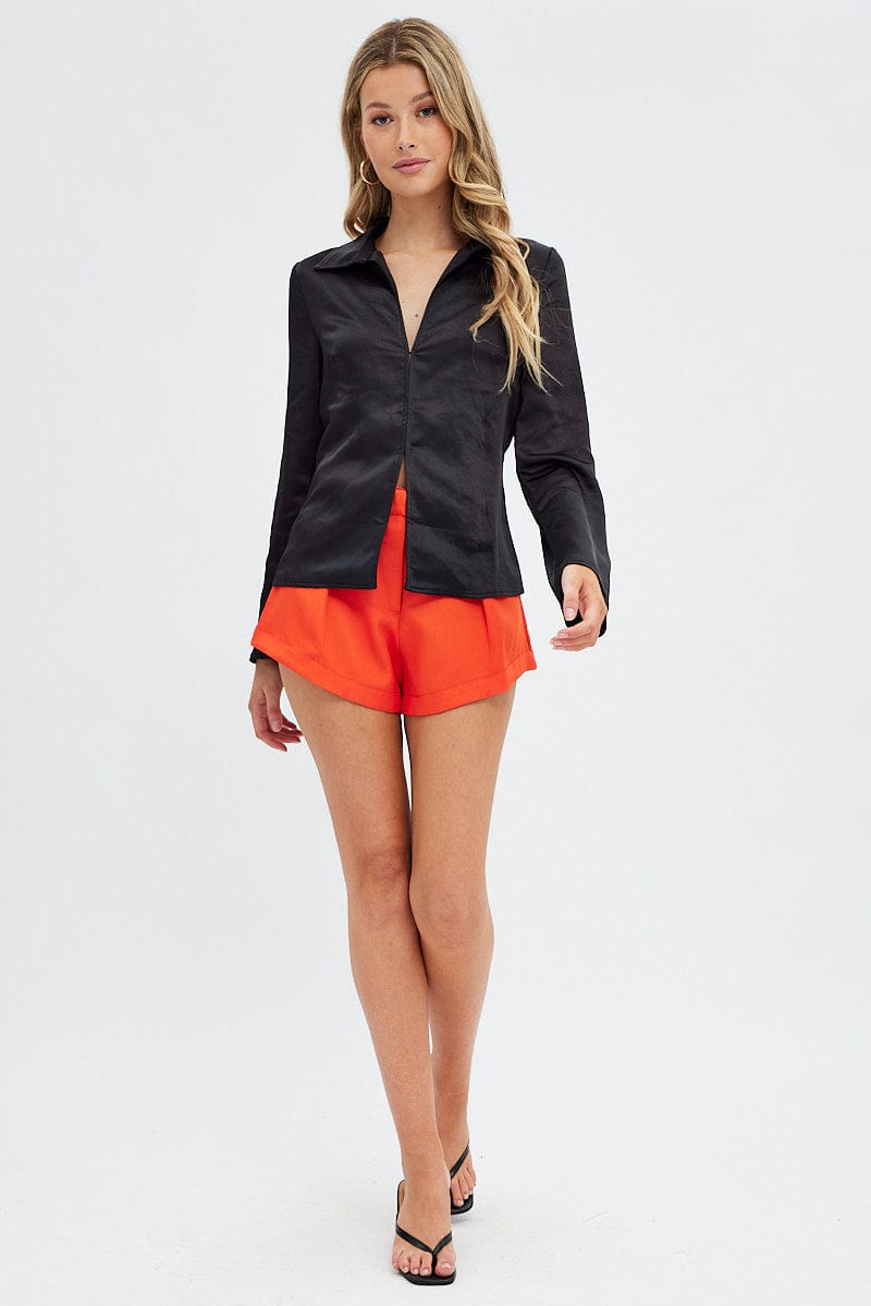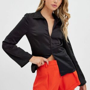 Black Shirt Long Sleeve Collared Hook & Eye Satin Crepe